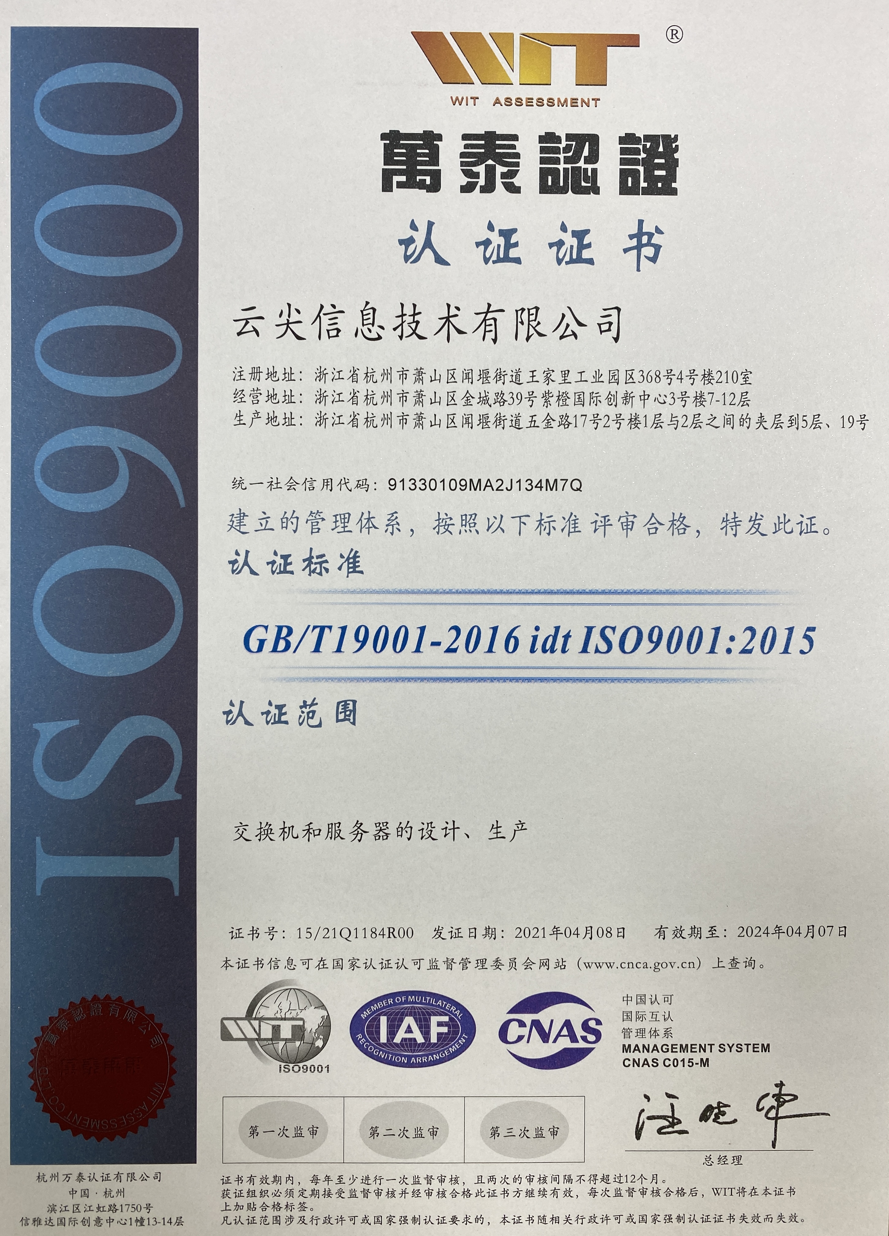 On April 8, 2021, Yunjian Information successfully passed the ISO9001 quality management system certification, marking that the company's attention to and investment in quality management has been recognized by the industry. In the future, Yunjian Information will continue to increase investment in quality management to achieve a continuous high level of delivery and service commitment to customers.