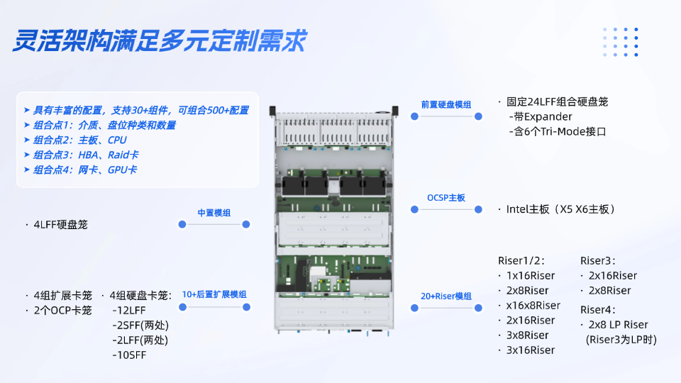 ○ 在44個3.5槽位和12個NVMe槽位間靈活配置