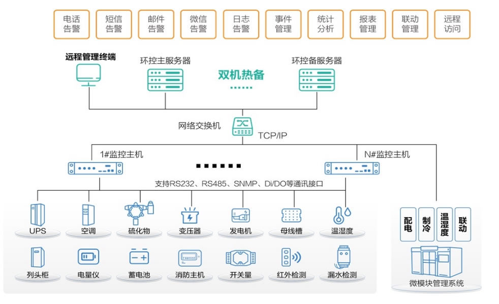 動(dòng)環(huán)監(jiān)控通過(guò)DCIM平臺(tái)對(duì)實(shí)現(xiàn)UPS設(shè)備、低壓配電柜、精密列頭柜、蓄電池組、發(fā)電機(jī)組、溫濕度監(jiān)測(cè)、機(jī)柜微環(huán)境、漏水監(jiān)測(cè)、消防監(jiān)測(cè)等子系統(tǒng)在統(tǒng)一的管理平臺(tái)上進(jìn)行集中管理及集成,真正做到數(shù)據(jù)共享。同時(shí)對(duì)視頻監(jiān)控系統(tǒng)、門禁管理系統(tǒng)、防盜報(bào)警系統(tǒng)、BA自控系統(tǒng)等進(jìn)行集成,在大動(dòng)環(huán)平臺(tái)內(nèi)對(duì)上述系統(tǒng)進(jìn)行實(shí)時(shí)監(jiān)測(cè)、查詢、聯(lián)動(dòng)、生成報(bào)表。
