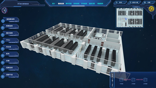 3D可視化采用最新的3D圖形技術(shù),實(shí)現(xiàn)對(duì)項(xiàng)目范圍內(nèi)的所有資產(chǎn)對(duì)象的虛擬仿真,以完全3D模式構(gòu)建整個(gè)數(shù)據(jù)中心環(huán)境,系統(tǒng)的設(shè)計(jì)需靈活易用,界面簡(jiǎn)潔美觀;實(shí)現(xiàn)數(shù)據(jù)中心所在建筑外觀、數(shù)據(jù)中心所在樓層及數(shù)據(jù)中心內(nèi)部環(huán)境的虛擬仿真,3D建模的結(jié)果需要與真實(shí)環(huán)境一致,包括結(jié)構(gòu)、尺寸,以及內(nèi)部的裝修風(fēng)格等。