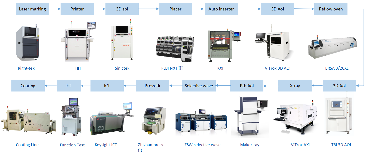 SMT production line has the most complete process/equipment configuration, using the industry's mainstream first-line brands, according to customer needs to set up product lines